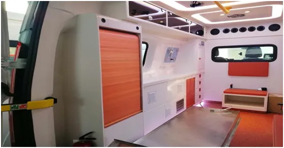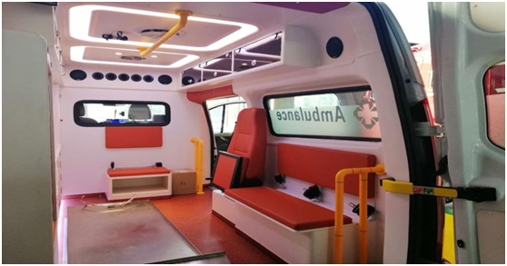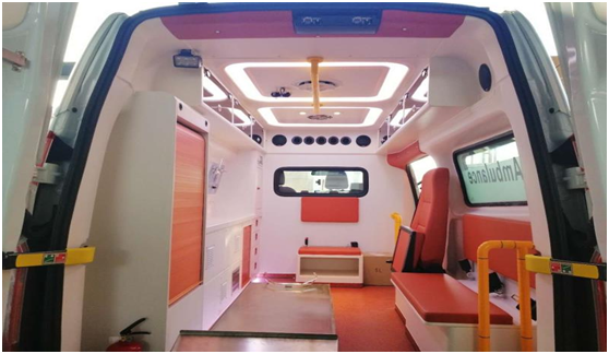 泰格红嵌入式警灯设计,内饰采用ABS复合材料或模具形成工艺,表面光洁、抗菌、硬度高、阻燃环保。防滑、耐磨可医用清洗地板。原车供电系统、外接电源系统、交流电路防护系统,可供不同电压不间断供电。1000W正弦波逆变电系统。微电路集中控制系统、驾驶舱紧急启动系统、集成开关控制、液晶显示设备状态。品牌警灯,LED爆闪灯、舱内医疗专用LED灯、后射灯、车厢左右侧照明灯、双向换气扇、嵌入式紫外线消毒灯,定时杀菌。供氧系统10升氧气瓶2只及专用减震卡箍,氧气减压阀,湿化瓶、隐藏式氧气管道,国标氧气端口。医疗舱配备反向折叠座椅、3点式安全带独立座椅、3人长条横向软包座椅。可滑动输液架及2组输液瓶挂钩。中门、尾门、顶部安全扶手。对讲系统前后窗口对讲机、单向控制等。